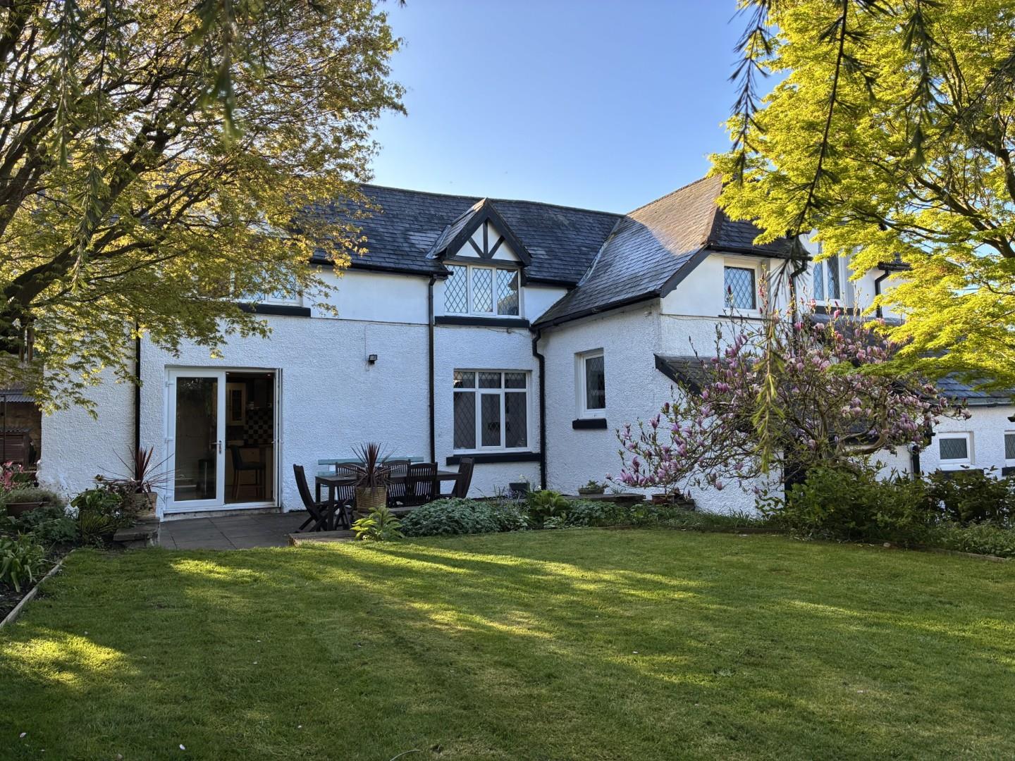 A GREATLY EXTENDED AND IMPOSING FOUR BEDROOM DETACHED HOUSE standing in a slightly elevated setting amidst landscaped gardens of just over half an acre, located in a secluded position in the heart of the village some 2.5 miles from Ruthin. Dating originally from the early 20th century, this unique home has been extended and re-modelled to provide a versatile house. Approached over a long sweeping driveway, it affords a large conservatory/porch, central hall, extended lounge, study, splendid contemporary fitted kitchen/dining and day room with a large adjoining utility room and cloakroom. First floor L-shaped landing, main bedroom with en suite, three further double bedrooms and luxury bathroom. Extensive landscaped gardens mainly to the rear with sheltered patios and lawns, double garage, workshop, stores and beautiful upper garden with large water feature and summerhouse designed to take full advantage of the far reaching westerly views over the vale. Inspection highly recommended.